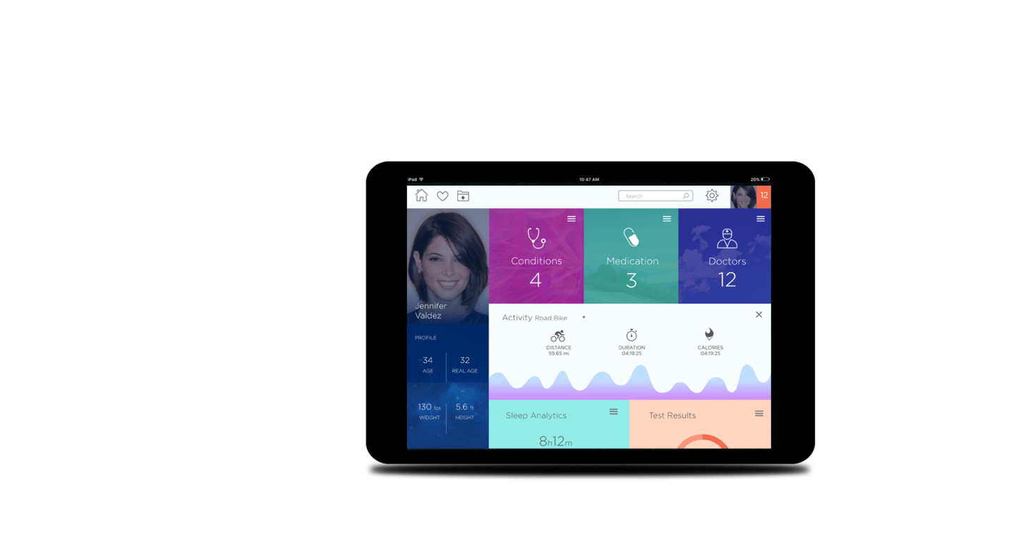 Here is a mockup that I did for a heath app. Below is the home page. Here you can see the patient’s profile, health conditions, medications that they take and the doctors that fit there needs in their area. You also have the activity, sleep and test result sections. In this mockup the activity section is selected and it shows a more detailed view. If you select another tile it will open and show more details.